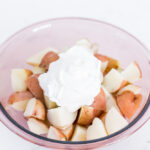 I used small, red potatoes for the salad. I gave them a good scrub, then cut them into quarters, or bite-size pieces. I placed them into a large pot, then filled the pot with water until it was just covering the tops of the potatoes. If you prefer russet potatoes you can use those, just make sure to cut into small enough pieces. Also if you prefer no skin, you can peel, I personally like the texture in this baked potato salad recipe.