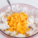Then it’s time for the cheese! I used medium cheddar, but you could use whatever you like. A sharp cheddar cheese is also delicious.