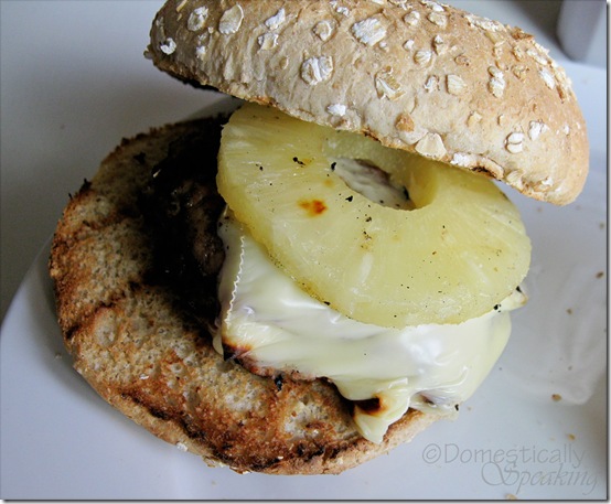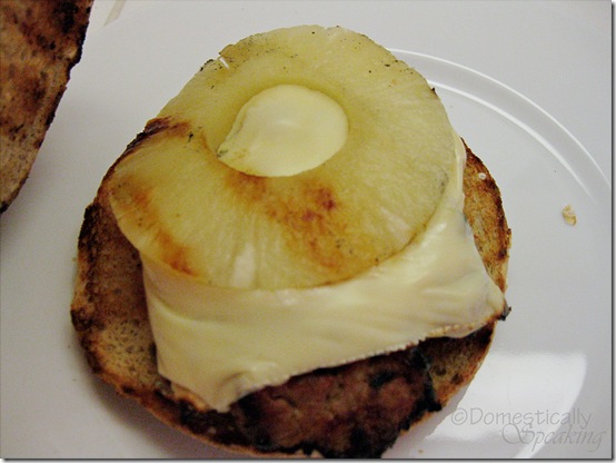 Bun… turkey burger with cheese… pineapple ring… bun…. yum!